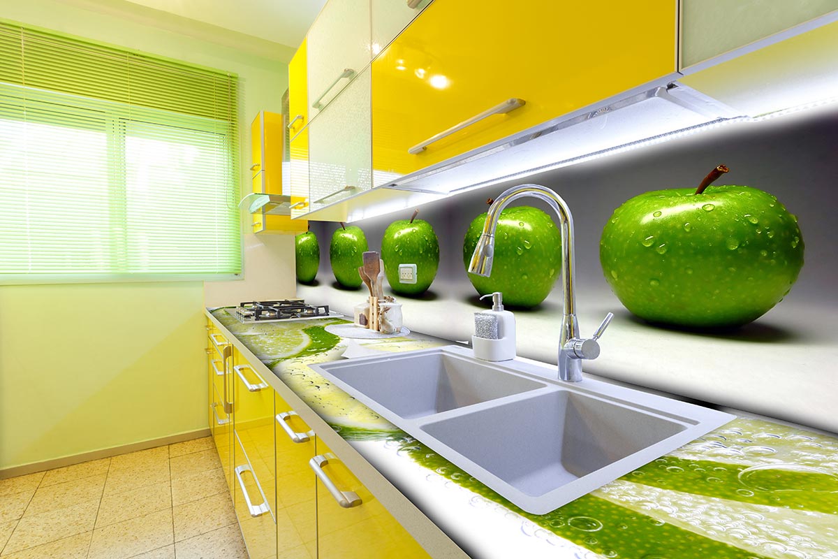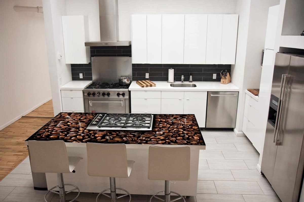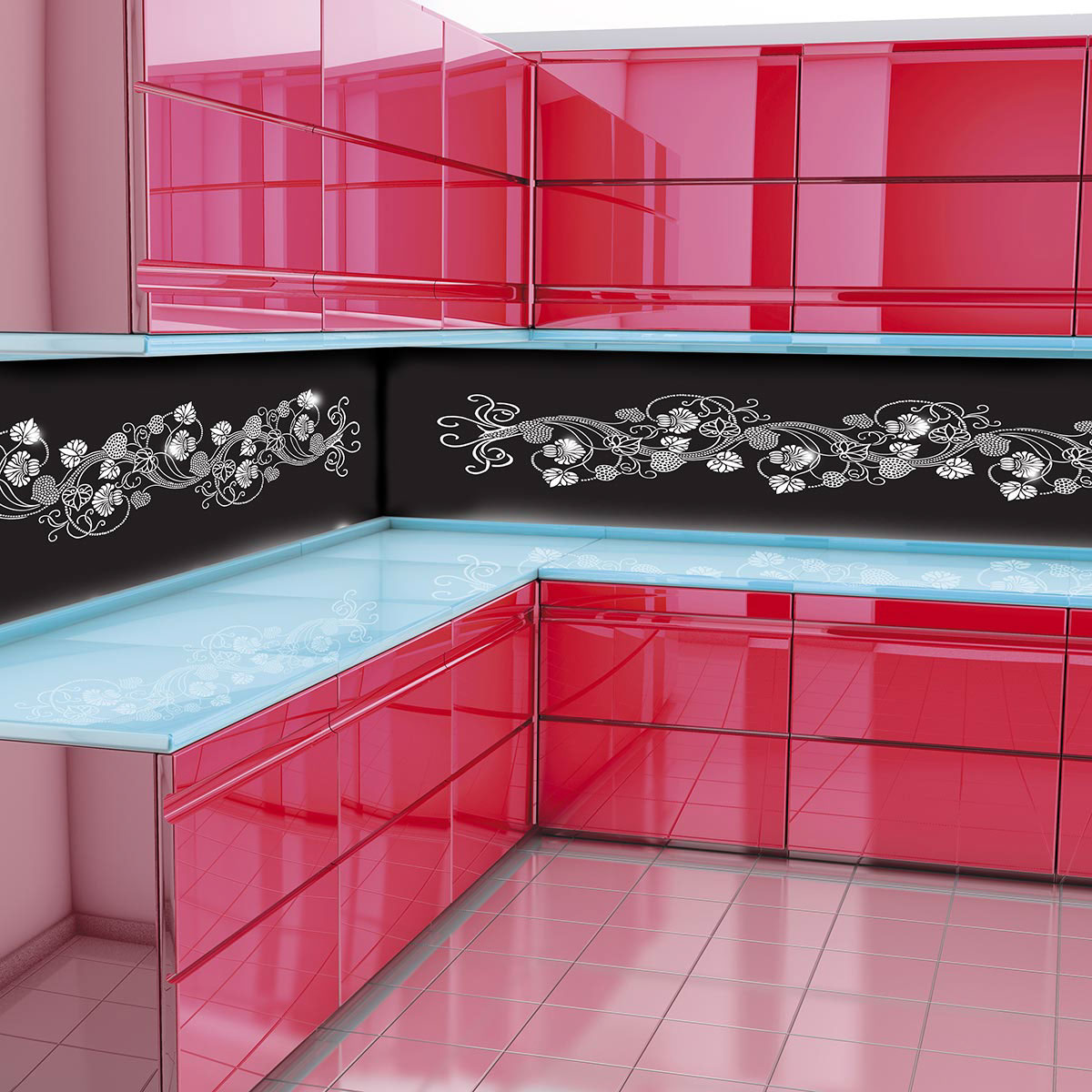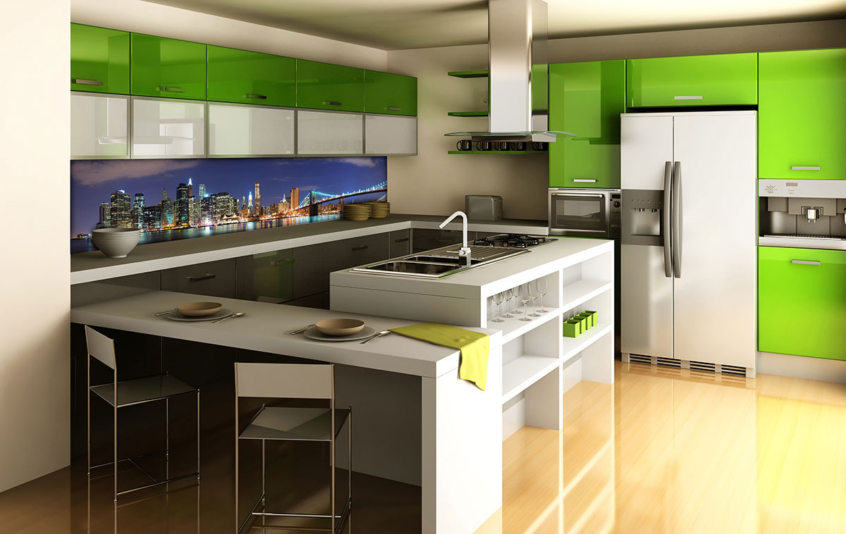Die aus 19 mm Glas gefertigten Arbeitsplatten sind auf Wunsch mit Aussparungen für Herd und Spüle versehen.